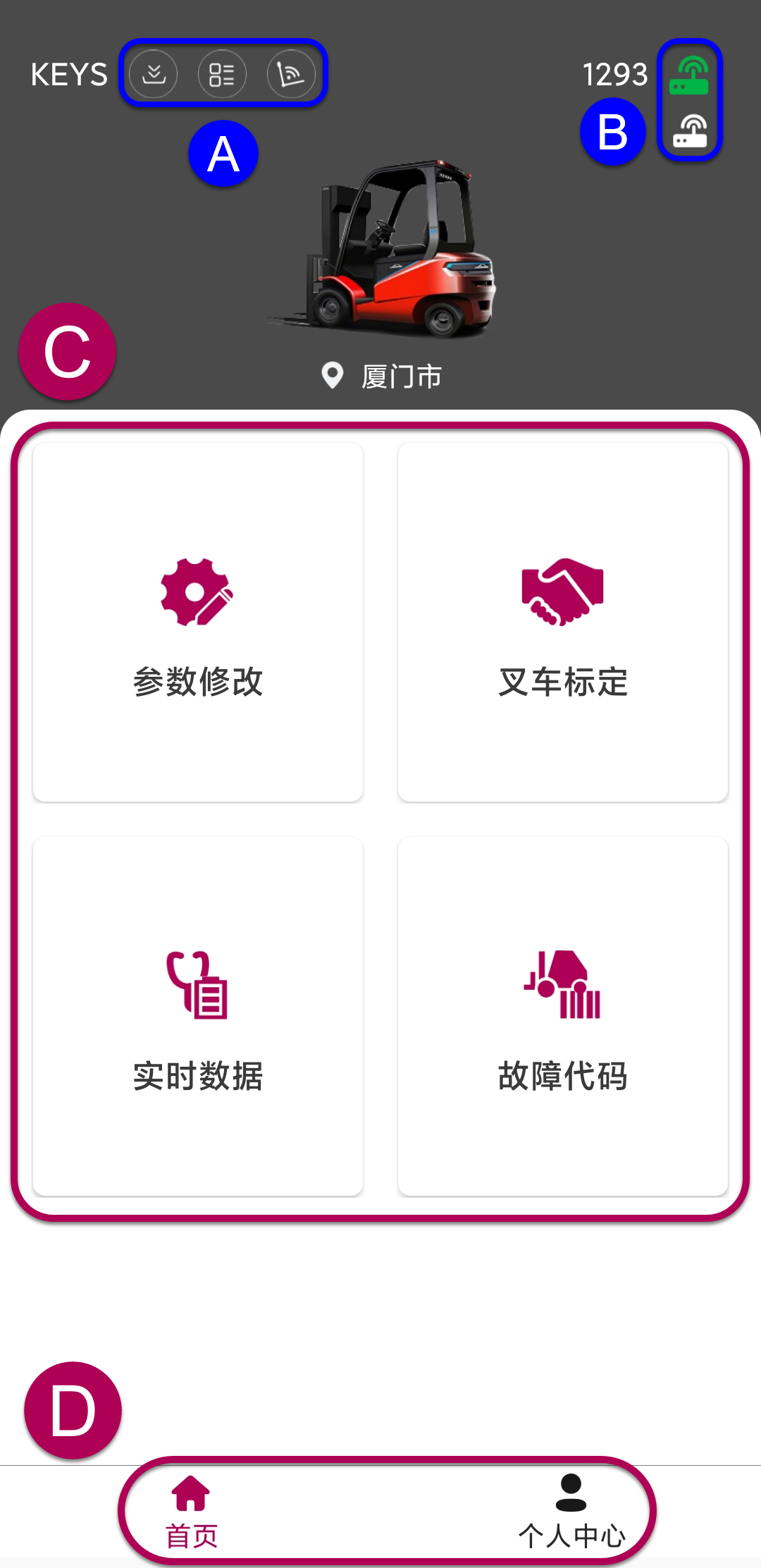 KEYS APP 软件包含四大诊断功能模块:实时数据、参数修改、故障代码、叉车标定模块,包括实时数据图表化显示、读取故障代码附码解析等 LSG 尚不具备的功能。