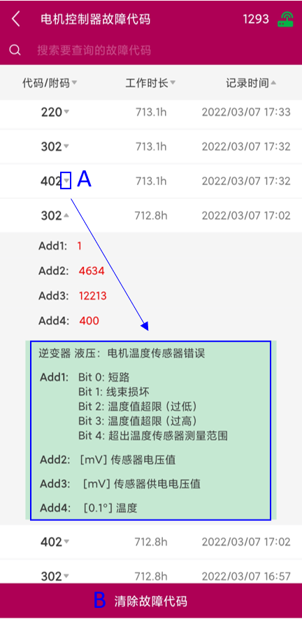 服务故障代码显示 ECU 距离上一次服务后产生的故障代码,可删除,可按产生时间、代码名称、工作小时数排序